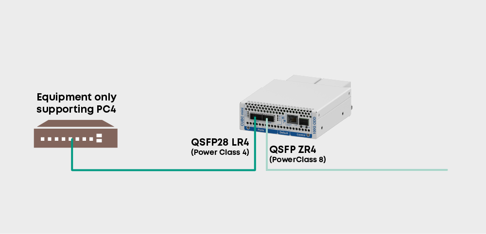 MSA specifies power classes (PC) for QSFP28 transceivers, meaning how much electrical power the transceivers require. The majority of QSFP28 routers natively support up to 3.5W per port. However, nowadays there are the high-power transceivers such as ZR4 (80km) that require ~6.5W. As the CUBOmini supports up to 8W, it is a cost-effective power class converter.